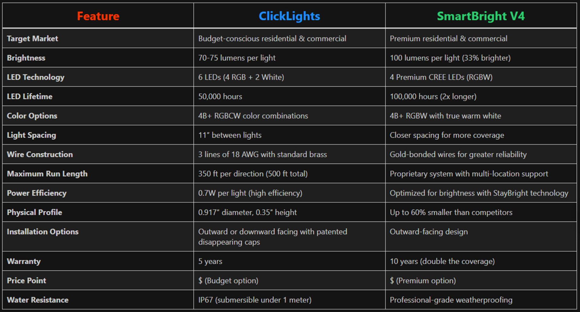 - Specs: ~70 lm/light · 24V · 0.917″ hole · IP67 · ~11″ spacing · ~50k-hour LED life